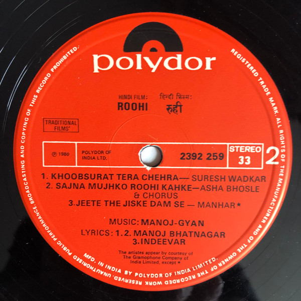 Manoj-Gyan – Roohi Lyrics By – Indeevar* (tracks: A1, A2, B3), Manoj Bhatnagar (tracks: B1, B2) Music By – Manoj-Gyan