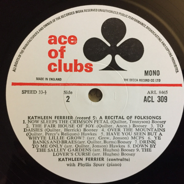 Kathleen Ferrier – A Song Recital Record 5 Label: Ace Of Clubs – ACL 309 Series: Kathleen Ferrier – Record