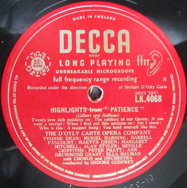 Gilbert & Sullivan – Highlights From “Patience” & “The Mikado” Label: Decca – LK 4068 Format: Vinyl, LP, Mono Country: