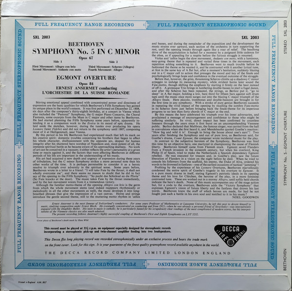 Beethoven, Ansermet, L’Orchestre De La Suisse Romande – Symphony No. 5 ∙ Egmont Overture   Label: Decca – SXL 2003