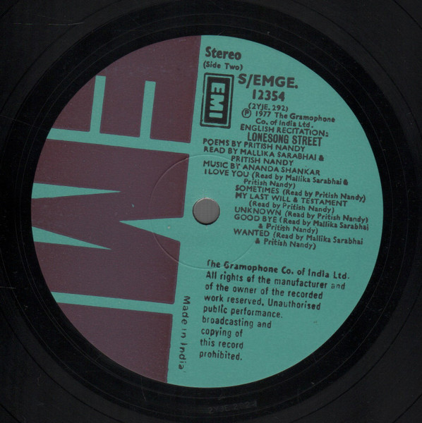 Pritish Nandy, Mallika Sarabhai, Ananda Shankar – Lonesong Street   Label: EMI – S/EMGE 12354 Format: Vinyl, LP, Album, Stereo