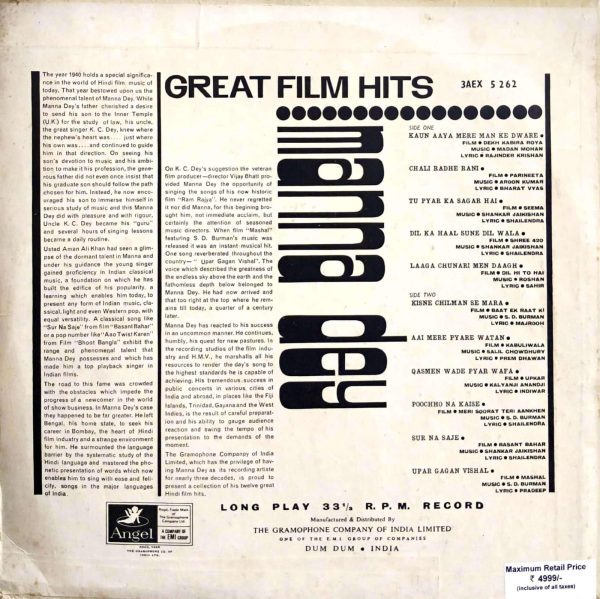Manna Dey – Great Film Hits   Label: Odean Records – 3AEX 5 262, Odean Records – 3AEX 5262 Format: