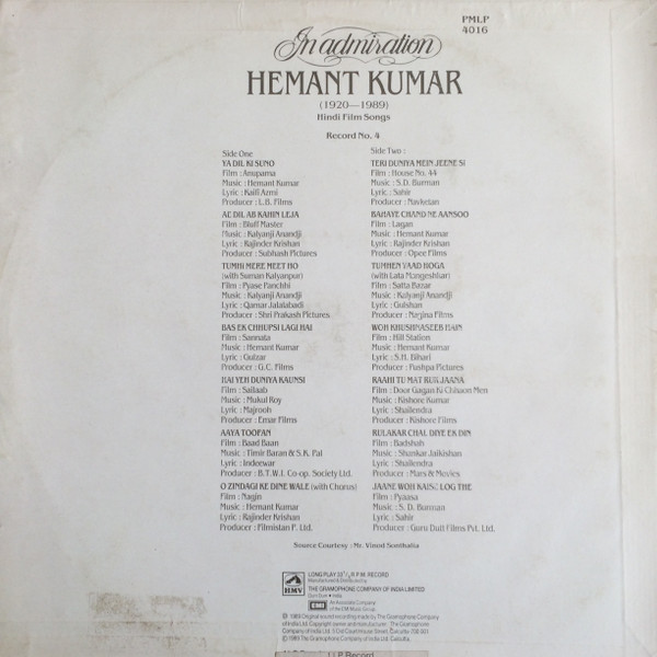 Hemant Kumar – In Admiration Hemant Kumar (1920-1989) Hindi Film Songs – Record No. 4 Label: His Master’s Voice –