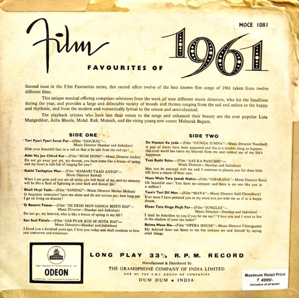 Various – Film Favourites Of 1961 Label: Odean Records – MOCE 1081 Format: Vinyl, LP, Compilation, Mono Country: India Released: