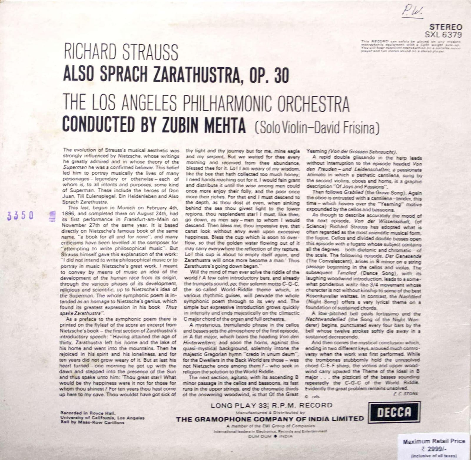 Also Sprach Zarathustra, Richard Strauss, Los Angeles Philharmonic, Zubin Mehta, Vinyl Record, Lp