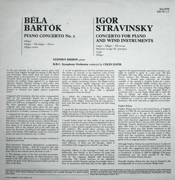 Bartók, Stravinsky, Stephen Bishop (3), Colin Davis – Piano Concerto No. 2 / Concerto For Piano And Wind, Vinyl Record, Lp
