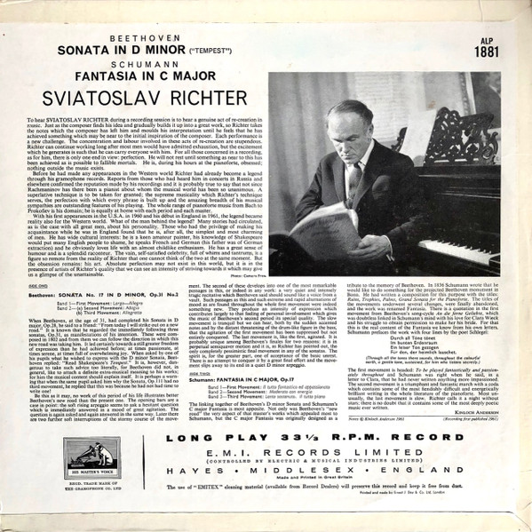 Beethoven* / Schumann* : Sviatoslav Richter – Sonata In D Minor “Tempest” / Fantasia In C Major