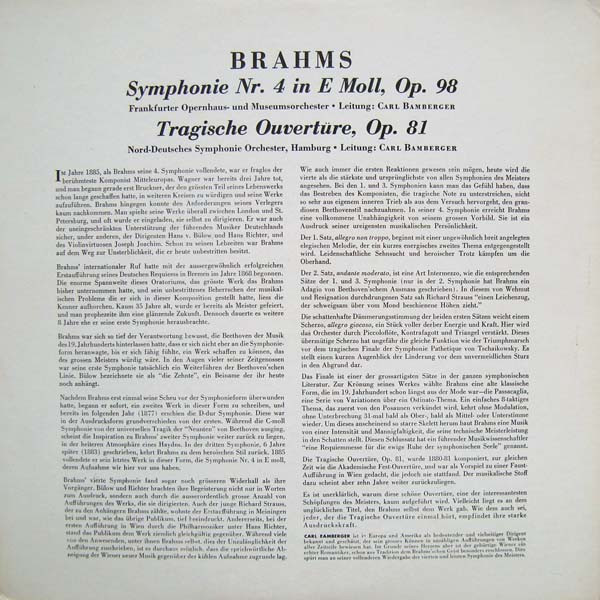 Brahms – Frankfurter Opern orchester, The Nord-Deutsches Symphony Orchestra* Leitung Carl Bamberger – Symphonie Nr. 4 • Tragische Ouverture