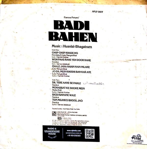 Hudnall-Bhagatram* ‎– Badi Bahen Label: His Master’s Voice ‎– HFLP 3607, RPG Enterprises ‎– HFLP 3607 Format: Vinyl, LP, Mono