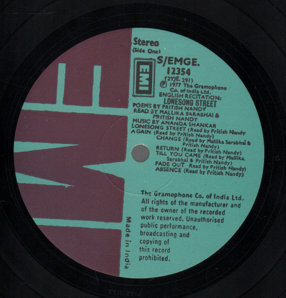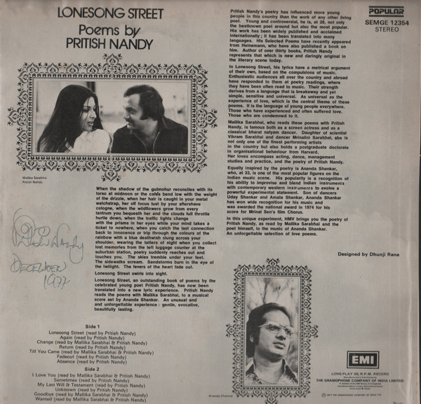 Home Poetry: Spoken Word Lonesong Street, Pritish Nandy, Mallika Sarabhai, Ananda Shankar, Vinyl Record, Lp