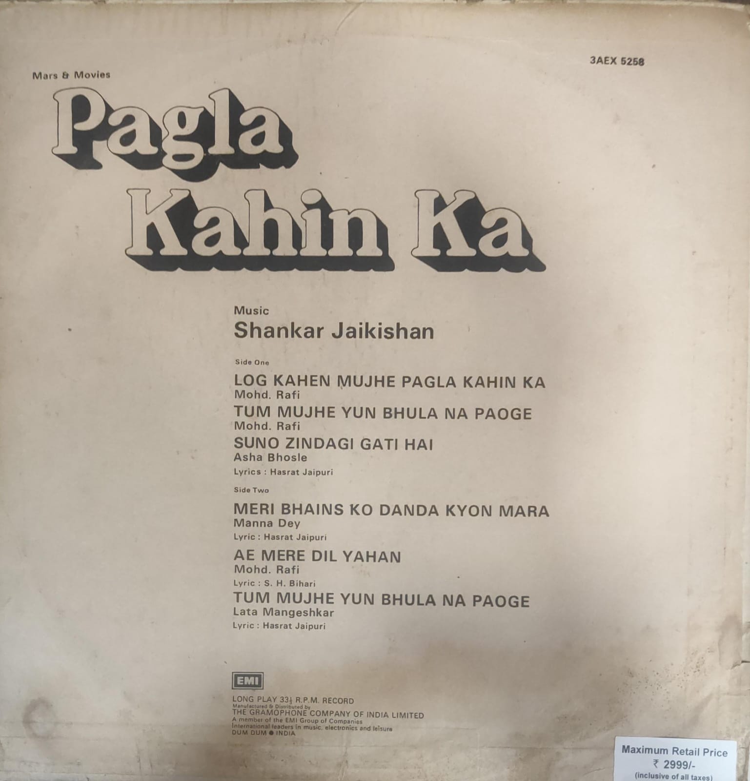 Lyrics By – Hasrat Jaipuri (tracks: A1-A3, B1, B3), S. H. Bihari (tracks: B2)