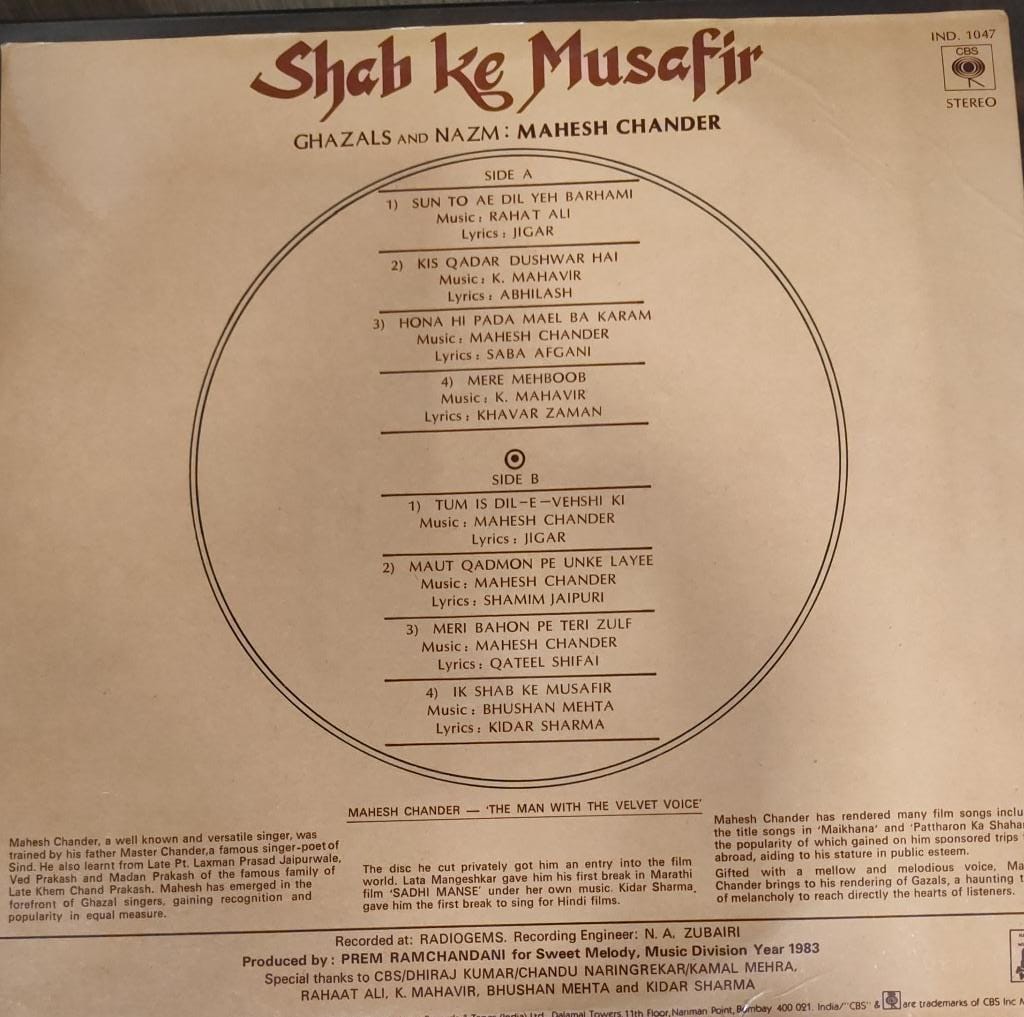 Home Ghazal Vinyl Shab Ke Musafir-Ghazals And Nazm, Mahesh Chander, Vinyl Record, Lp