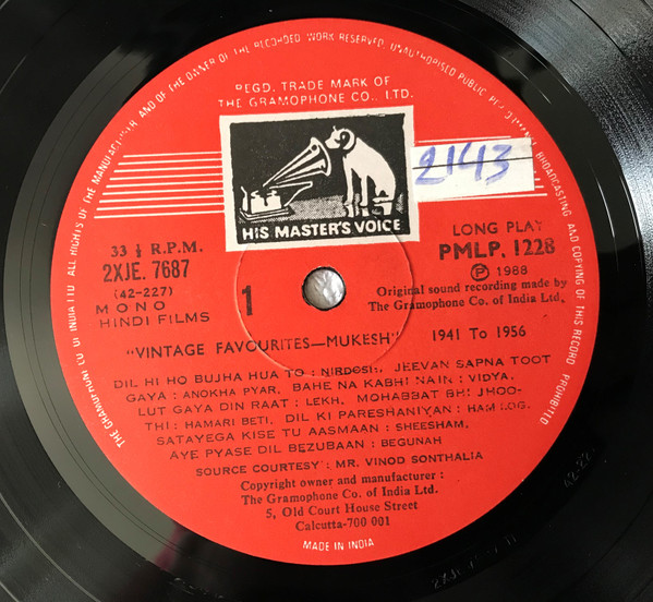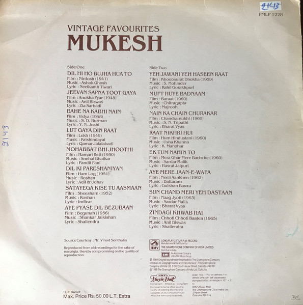 Vintage Favourites, Mukesh, Vinyl Record, Lp